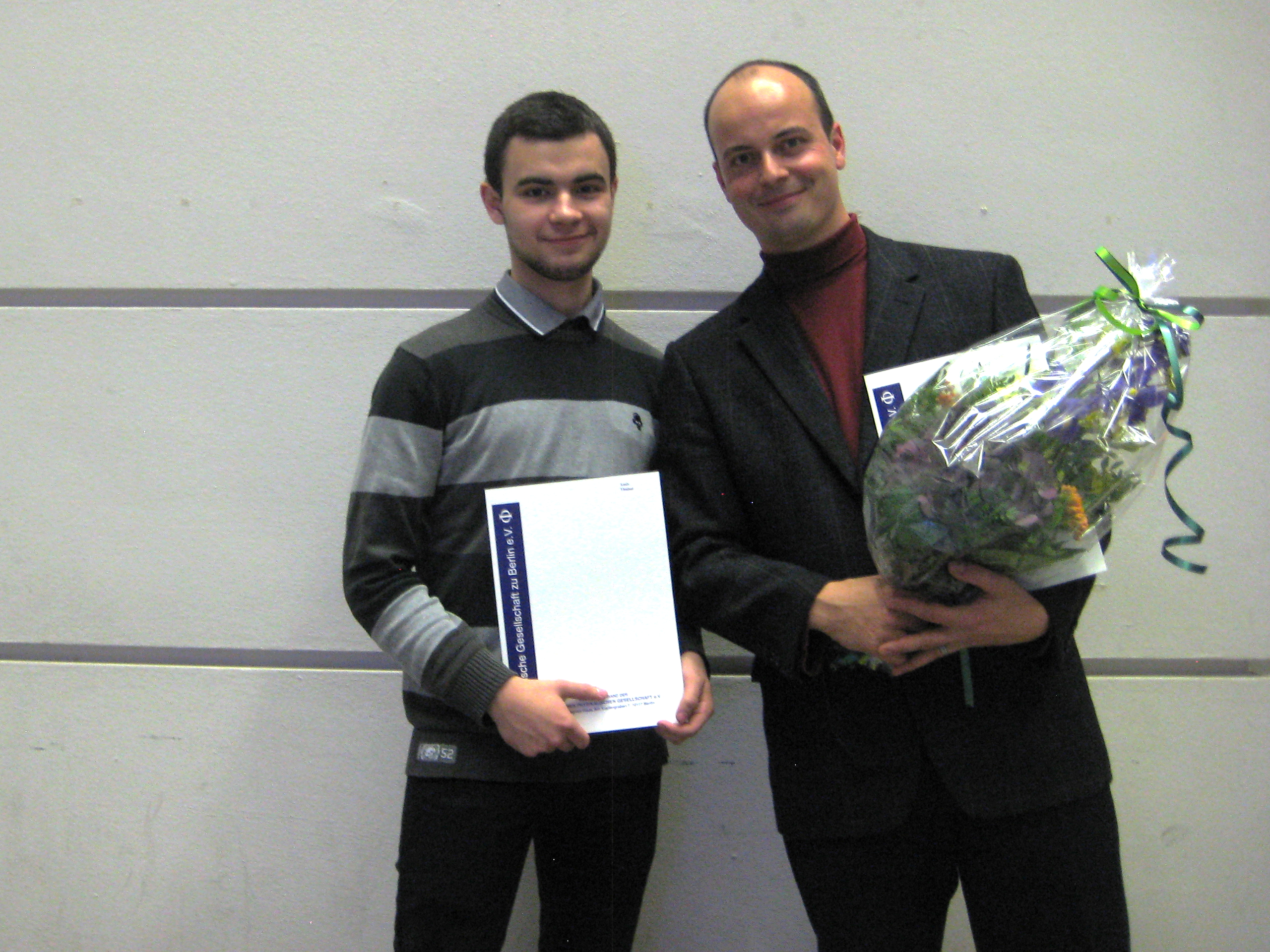 Der Berliner Regionalverband der Deutschen Physikalischen Gesellschaft, die Physikalische Gesellschaft zu Berlin (PGzB), hatte auch in diesem Jahr diejenigen Schülerinnen und Schüler mit einem Buchpreis ausgezeichnet, die in ihren Physik-Leistungskursen in den ersten beiden Semestern jeweils das beste Ergebnis erzielen konnten. In diesem Jahr wurden vom Herder-Gymnasium David-Christopher Schubert und Dehua Duan geehrt. weiterlesen...