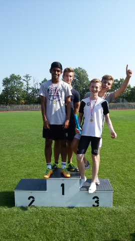 Beim anschließenden Wettkampf der Oberschulen konnten unsere Teams nahtlos an diese Erfolge anknüpfen. Die Staffeln über 4 x 100m der Jungen (WK II) und 3 x 800m der Mädchen (WK II) stürmten in hervorragenden Zeiten auf den ersten Platz und wurden mit Gold belohnt. Eine Silbermedaille erkämpften sich zudem die beiden Staffeln über 3 x 800m der Jungen (WK I und II). Auch diese vier Staffeln werden unsere Schule Anfang Oktober bei den Berliner Meisterschaften vertreten. Abgerundet wurde das glänzende Abschneiden des Herder-Gymnasiums durch eine Bronzemedaille über 3 x 800m der Jungen in der WK III sowie zwei fünfte Plätze über 3 x 800m der Mädchen (WK III) und Jungen (WK IV).